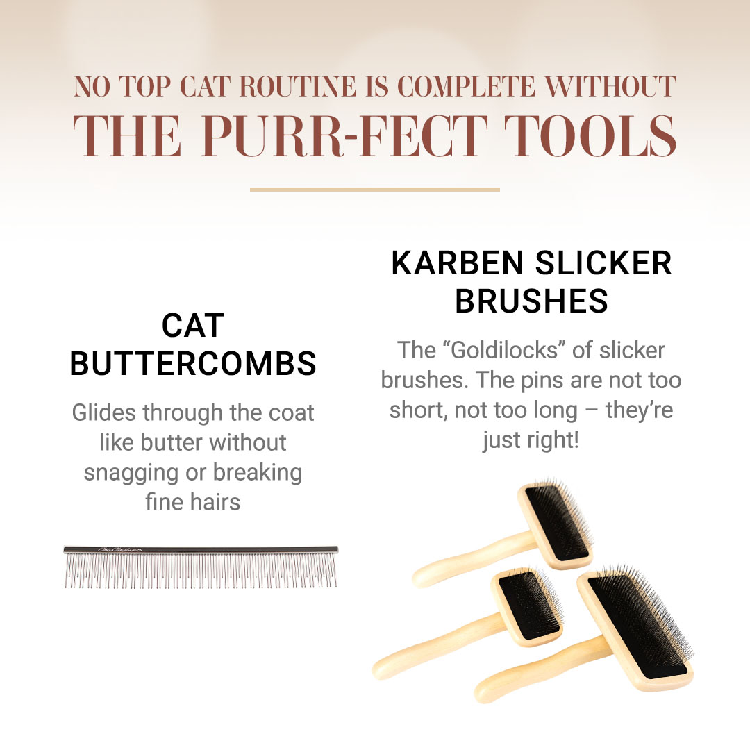 Hello, there! At Chris Christensen, we believe that while not every cat is a show cat, every cat deserves to be a Chis Christensen Top Cat, because why shouldn't they? That's why we designed a line of feline-specific products! By focusing on the needs of cats, we have designed an exceptional line of products that cover each of the cat coat types, and solves a variety of problems show cat enthusiasts face such as stud tail, and getting the right texture for the coat.