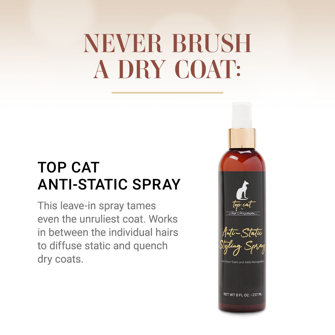 And don't forget: never brush a dry coat! Always begin by misting the coat with our Top Cat Anti-Static Spray, which tames even the unruliest fur with ease. Having some sort of lubrication to help your brush and comb glide through is important to prevent damage and reduce static. Once the coat becomes statically charged, it picks up debris easier and becomes dirty faster. This spray helps the coat repel debris. And with that, you have now completed a Top Cat Bath and Brush!